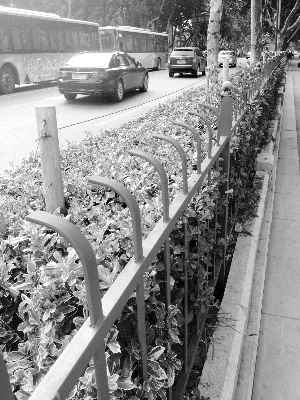 昨天下午,在中山北路紫峰大廈附近的路段看到,這段綠島中有兩道南京護欄網欄桿,一道灰色的鐵絲南京護欄網價格欄桿看上去有些銹蝕,高度大約到成年男子的腰部。另一道雙邊絲護欄網欄桿看上去很新,是鮮亮的綠色,南京護欄網價格欄桿上端向機動車道方向彎曲。